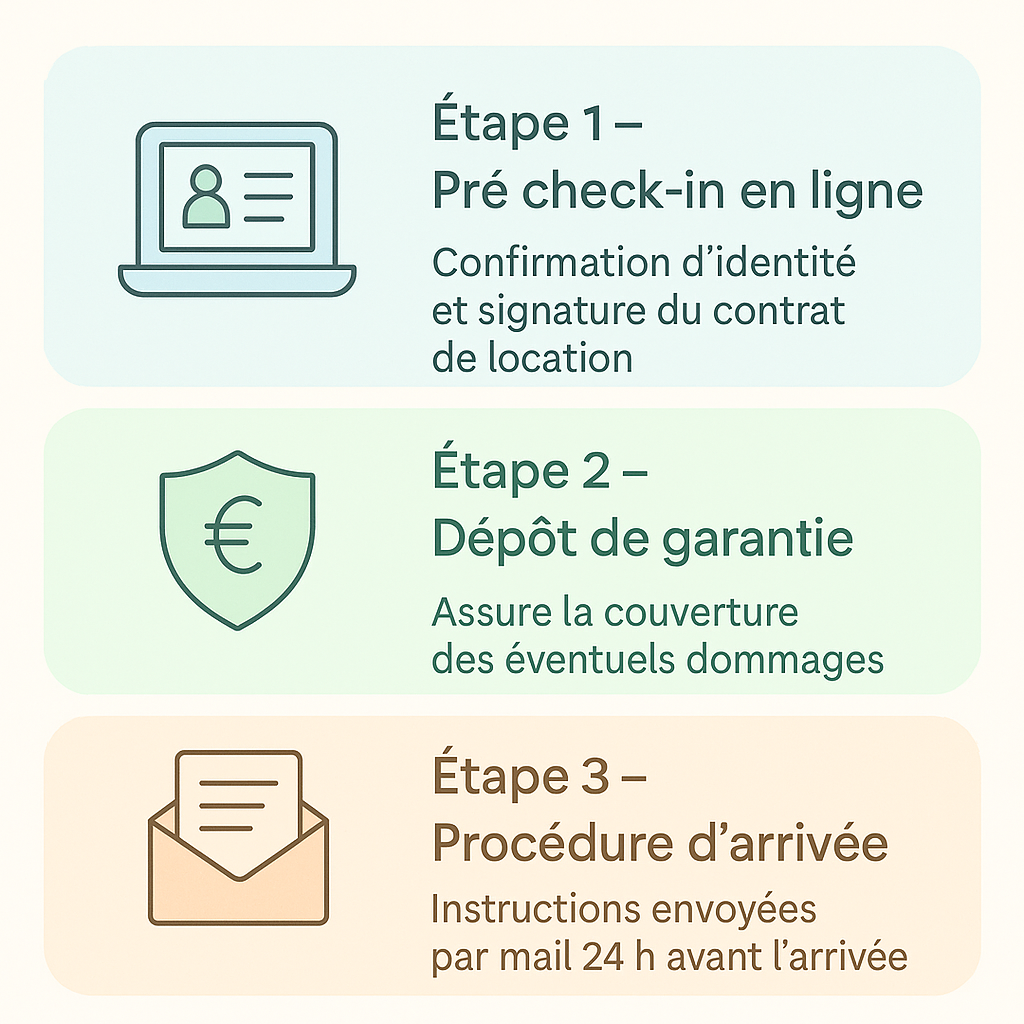 L'arrivée dans l'appartement ainsi que le départ se font de manière autonome à l'aide d'une boîte à clef électronique . Un code personnel vous est envoyé par e-mail 24h avant votre arrivée , sous réserve que le pré check-in et le dépôt de garantie aient été validés au préalable. La procédure d’arrivée détaillée est également envoyée par e-mail en même temps que le code de la boîte à clés.